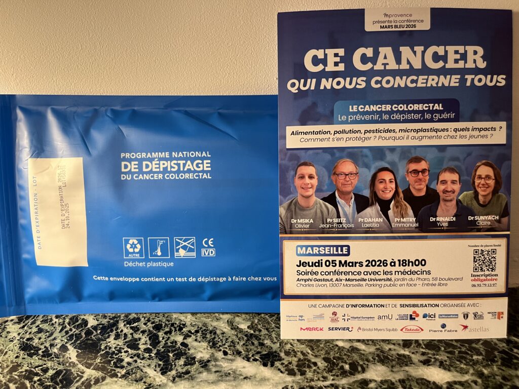 MProvence, en partenariat avec les hôpitaux de notre région, organise quatre conférences publiques et gratuites à l’occasion de Mars Bleu, le mois dédié à la prévention du cancer colorectal. Vous pourrez y entendre des médecins et nutritionnistes qui donneront des conseils alimentaires et sportifs. La conférence inaugurale se déroulera jeudi 5 mars à 18h, amphi Gastaut, Aix Marseille Université, jardin Emile-Duclaux (Pharo), 58 Bd Charles Livon, 13007 Marseille. Coordination scientifique : Pr Jean-François Seitz. Entrée libre sur inscription obligatoire en lien dans le bandeau bleu en haut de cet article ou au 06 95 79 13 97.
